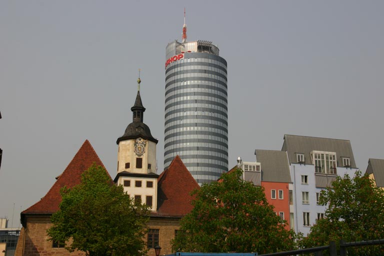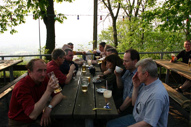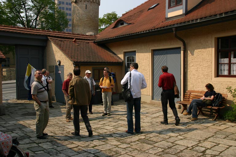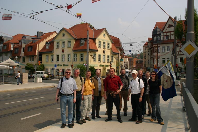 diesmal in Jena In diesem Jahr trafen wir uns auf Einladung unseres "Spatz" genannten Sperlings in der Universitätsstadt Jena. dafür suchten wir uns das Wochenende vom 5.5.-7.5 heraus und hatten dazu auch schönes Wetter organisiert. Freitag, 5.5. abendliche Anreise, Quartiernahem in einer netten Pension und Treff im Biergarten. Dann ging es noch in die Kneipe und natürlich zu den nachmitternächtlichen Abschlussdiskussionen ... Sonnabend 6.5. zu christlicher Zeit Start und mit Straßenbahn nach Jena. Spatz führt uns sachkundig zu den Höhepunkten der geschichtsträchtigen Stadt - die Fahne immer am Mann.