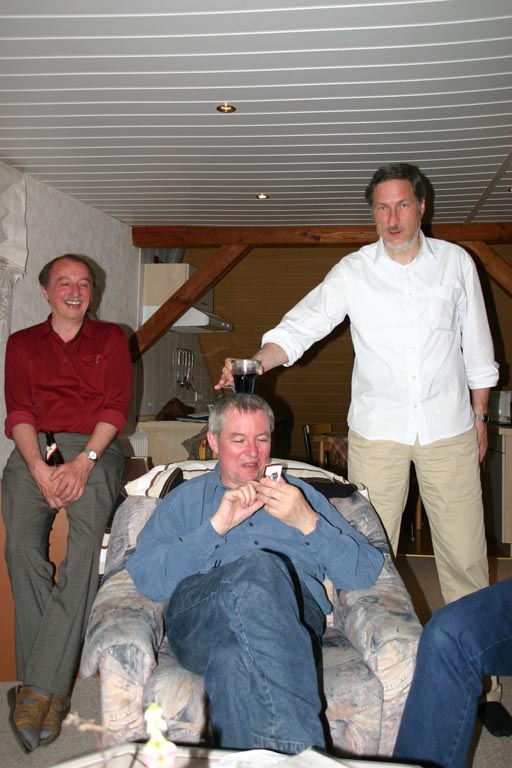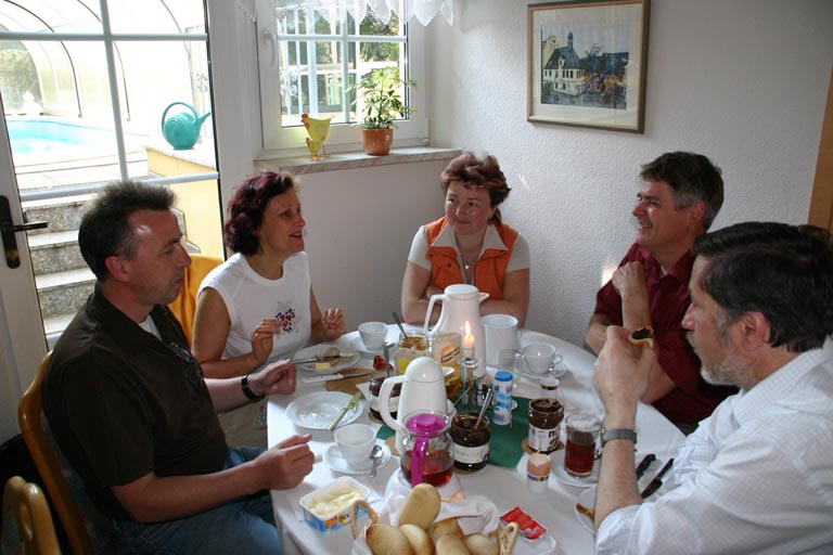 Besonderer Höhe punkt das Gruppenbild vorm Haus der Burschenschaftem - man beachte die Fahne(n). Dann wird auf die Berge gewandert und immer wieder pausiert und diskutiert. Abends dann die Beschriftung der Traditionsfahne und die üblichen Abendgenüsse der Physiker: Wein, (Kaum Weib) und Gesang, aber eine Absacher-Party: Nach einem stärkendem Frühstück ging es dann wieder nach Hause - aber mit dem Vorsatz uns schon in zwei Jahren bei Uta in Hoyerswerda zu treffen !