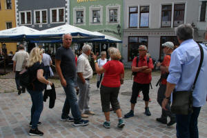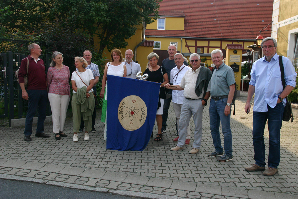 Dann Appell vor der "Truppenfahne" im Hof vom Stammlokal: Schließlich die "Besteigung" des Boselfelsens gleich um die Ecke mit Blick bis in die Sächsische Schweiz: Nach kurzer Zwischenpause (Bier und Wein bei "Försters") ging es per Bus nach Meißen. Stadtbummel und Spaziergang hoch zur Burg: Abends ging es dann ab 19 Uhr zum "Dampfschiff", das uns aber 22 Uhr rausschmiss: Da auch bei "Försters" alles zugerammelt war, spazierten wir zur Elbe und genossen neben mitgebrachtem Wein auch die Musik unter Horst's Leitung. Alle waren da sichtlich entspannt: Nun ging es am Sonntag doch ans Abschiednehmen. Kontrovers wurde die Perspektive der nächsten Treffen diskutiert. Am Ende geht es wohl 2023/24 nach DD und 2026 dann auf große Fahrt zu Ulf nach Ösi-Land. Alle waren sich einig: Es war wieder toll! Vielen Dank an Jürgen!!! In Summe 12 Physikerinnen/Physiker plus Partner, ist doch super. Einige waren doch plausibel entschuldigt...