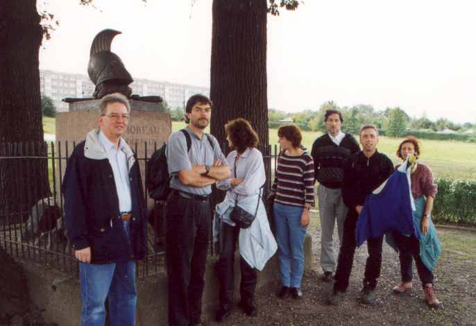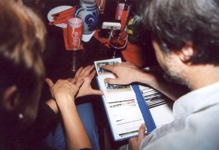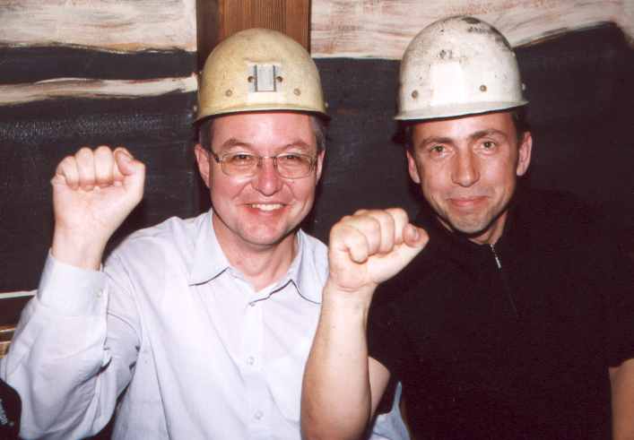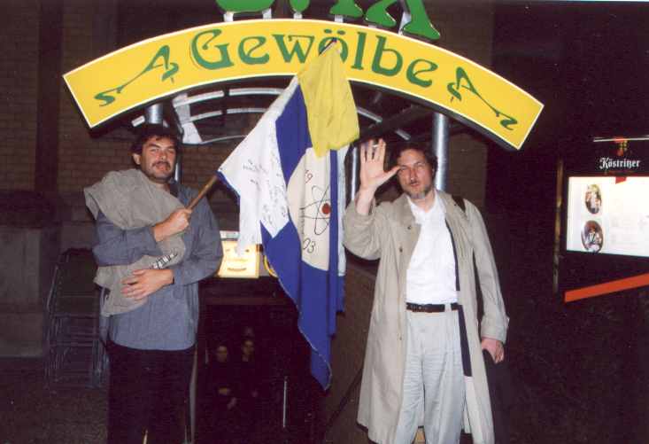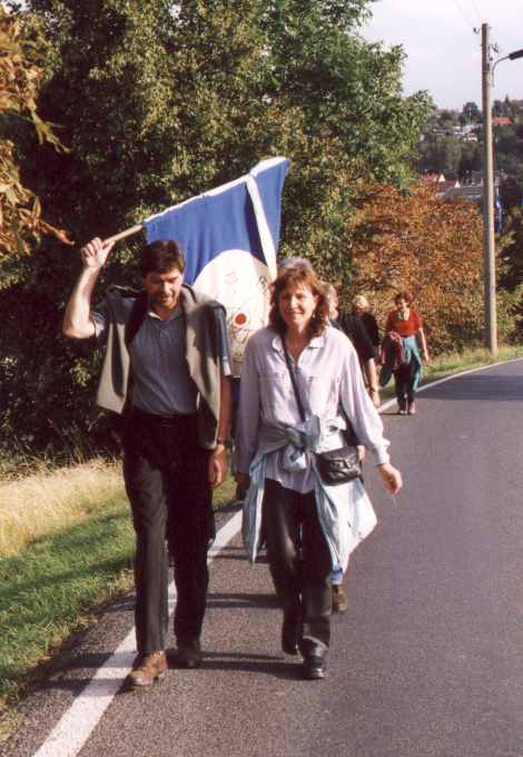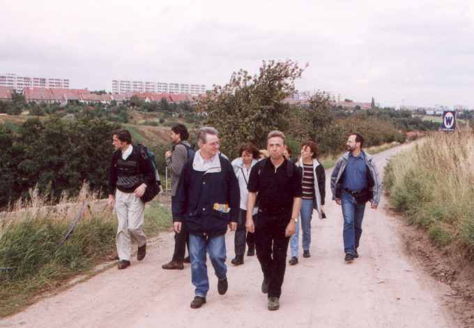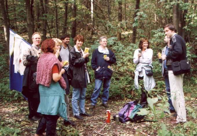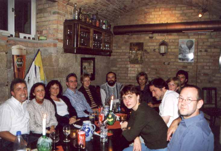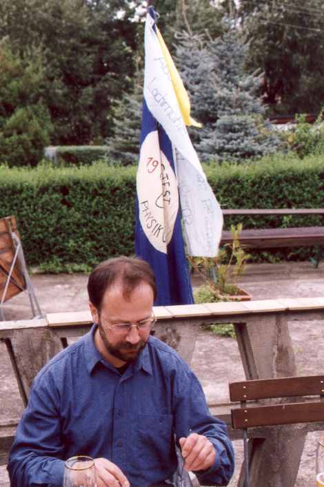 Am 14.-19. September 2001 war es nun so weit: 25. jähriges Studienbeginn-Jubiläum Leider war die Beteiligung insgesamt kein Ruhmesblatt: Dank verschiedener (un-?)wichtiger Abhaltungen einiger unserer gestressten, hochwichtigen, unabkömmlichen, ... Kollegen (das ist keine Diskriminierung, da die Damen durch 100 %ige Anwesenheit glänzten) waren wir nur 9 (und das zum von langer Hand vorbereiteten Jubiläumstreffen !!!) richtige Physiker. Da wir uns diesmal mit ein paar Partnern verstärkt hatten, sah das insgesamt dann doch noch ganz freundlich aus. Am Freitag (14.09.) trafen wir uns im Dresdner "SAX-Gewölbe", einer urigen Gewölbekneipe (Wiener Straße - Schleichwerbung), in dem es sich auch in etwas größerer Runde gut feiern lässt. Nach und nach trafen die Beteiligten ein und es wurde geschwatzt, gelacht und natürlich auf der Traditionsfahne unterschrieben: Am Sonnabend (15.09.) wandelten wir erst einmal auf historischen Pfaden. Unter sachkundiger Führung (nochmals besten Dank Herr W. K.) bewegten wir uns durch die Physik-Gebäude unserer guten alten TU. Großer Physikhörsaal, Computerkabinett, neue und alte Praktikumsräume. Manches sah noch so aus wie vor 25 Jahren ... Einer der unumstrittenen Höhepunkte war der Blick in die Kabinen des "Milikan-Versuches", bei dessen Bewältigung einer unsere Kommilitonen schon lange vor der Bestätigung durch theoretische Elementarteilchenphysiker die Existenz der halben Elementarladung (ungeteilt in Fachkreisen "e" genannt) entdeckt hatte ... Anschließend ging es mit etwas Verspätung (12.30 Uhr) zu einer Neuauflage unserer Kaitzbachtour von 1977 (siehe oben) - allerdings ohne Leiterwagen. Die Wanderung war insgesamt nicht allzu lang aber mit Erschwernissen und Höhepunkten gespickt: die wunderliche Mannschaft der "Glucke" zum Mittagessen, Wissenserweiterung beim Informationszentrum zum Autobahntunnelbau (das ist ein Wort !), Schlamm im Kaitzbachtal, immer mal eine Büchse Bier und schließlich noch ein Anstieg der mittleren Kategorie. Pünktlich 18.00 Uhr erreichten wir das Ziel unseres Ausfluges: den "Steigerkeller" im Gasthof "Zur Linde" in Freital. Hier verlebten wir umrahmt von bergmännischem Ambiente nochmals einen netten Abend. Erstaunlicherweise kamen wir diesmal ohne tiefgreifende politische Diskussionen davon. Dank einer Vielzahl alter Fotos und unserem (Bass-)Gitarristen wurde in Erinnerungen geschwelgt und dann zu später Stunde trotz großer (Text-)Schwierigkeiten die guten alten Songs von Udo L. angestimmt. Auch wenn unsere nette Kellner-Azubi(in) ihr Namensschild nicht für die Fahne spendieren wollte (Schiss vor'm Chef) - unterschreiben durfte sie. Und irgendwann spät in der Nacht gibt es das letzte Bier und die berühmte "letzte Zigarette" ... So kamen wir dann (hoffentlich) alle am Sonntag (16.09.) mit oder ohne "Absacker" (ohne den sind R.N. und S.O. nebst ihrem Taxi-Fahrer nicht ausgekommen) ins Bett und freuen uns auf das nächste Mal! Trotz der etwas spärlichen Besetzung war das Urteil aller ungeteilt: Ein gelungenes Treffen. Um mal etwas "Tapetenwechsel" zu haben, wollen wir uns in drei Jahren in Jena treffen - also dann "Auf Wiedersehen". Bis dahin ruht auch unsere Fahne sanft ... Noch eine Bemerkung für die