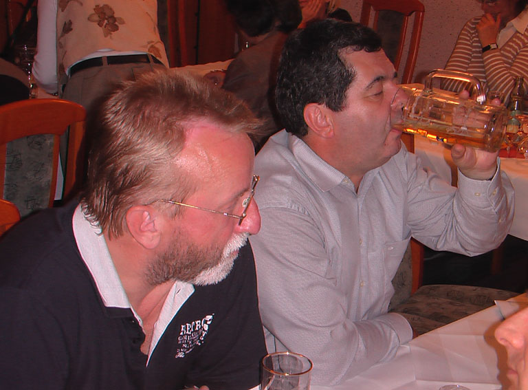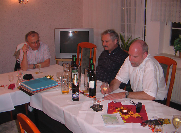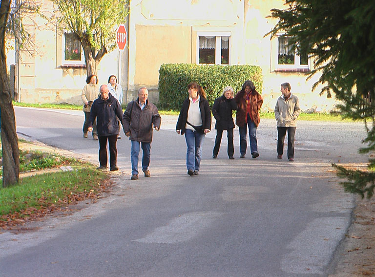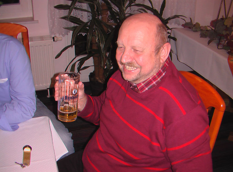 25. - 26. 10. 2008, Landgasthof in Kollm Exakt der gleiche Termin wie vor 5 Jahren - zwei inliegende Schaltjahre machten es möglich!!! Das Vorbereitungskomitee war auch 2008 sehr aktiv und scheute während etwa eines halben Jahren weder Kosten noch Mühen. Laut "Schülerbeschluss" ging es diesmal nicht in den "Alten Weber" - es wurde der Landgasthof in Kollm am Quitzdorfer Stausee nahe Bautzen. Die nachstehenden Fotos sind qualitativ leider nicht so super, da mit meiner Digital-Video-Kamera gemacht - dafür gibt es 2013 den nächsten Film als "Trost" - versprochen !!! Zwar (im Komitee) umstritten wurde die Besichtigung der neuen "MANOS" in der Haydnstraße am Sonnabend-Vormittag ein voller Erfolg. Alt-Zeichenlehrer Steglich machte eine interessante Führung durch das Haus und konnte Dank seiner Erinnerungen auch noch an unsere Erfahrungen aus den "wilden" 70ern anknüpfen. Der (wir nehmen an) Freistaat hat hier tief in die Tasche gegriffen und im alten Gehäuse eine supermoderne Musterschule errichtet. In Kollm ging es dann nach der Begrüßung nachmittags erst einmal auf eine Wanderung inklusive Turmbesteigung - und das bei "fast Sonnenschein": ein absolutes Novum in der Klassentreffengeschichte. Auch eine Premiere war die Eröffnung des Abends mit einer "Vorstellung der Teilnehmer" - je "Mann/Frau" etwa eine Minute brachte so manches interessante Detail ins Gedächtnis bzw. an den Tag. Nach der vorbereiteten visuellen Präsentation von Altem und Neuem aus der Schul-/Schüler-Geschichte (Dank hier insbesondere an Volker M. und unseren Dieter), wurden berühmte Fotos aus der Lamsfeld-Ära nachgestellt - allerdings (leider/Gott sei Dank?) in der falschen Kleiderordnung. Danach der traditionelle Sportwettkampf "Zeichner - Musiker" der wie so oft zugunsten der Musiker endete. Allen Unkenrufen zum Trotz (Marx'l : "...wir sind doch jetzt alt, so lange wird es nicht gehen...") saßen die Hartgesottenen (immer wieder die selben Gesichter...) wieder bis in den frühen Morgen - Rettung nahte ja in der Umstellung Sommer- zu Winter-Zeit. Frühstück ab Neun mit guter Laune - und dann mit großem Aufwand noch das Abschieds-Klassenfoto (das hier von Irene - danke!) Also dann bis 2013 !!! - natürlich in alter Frische !!!